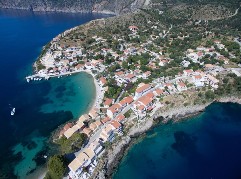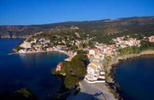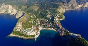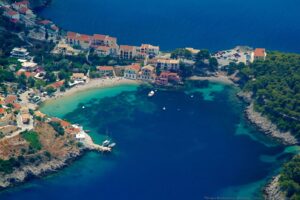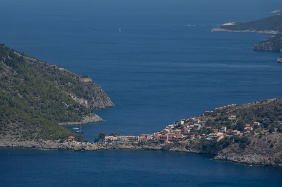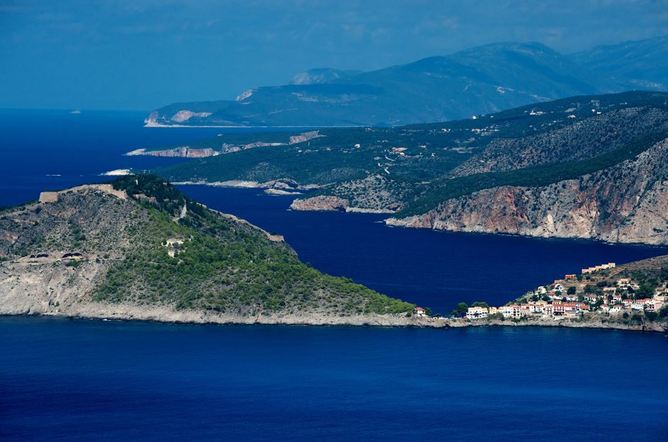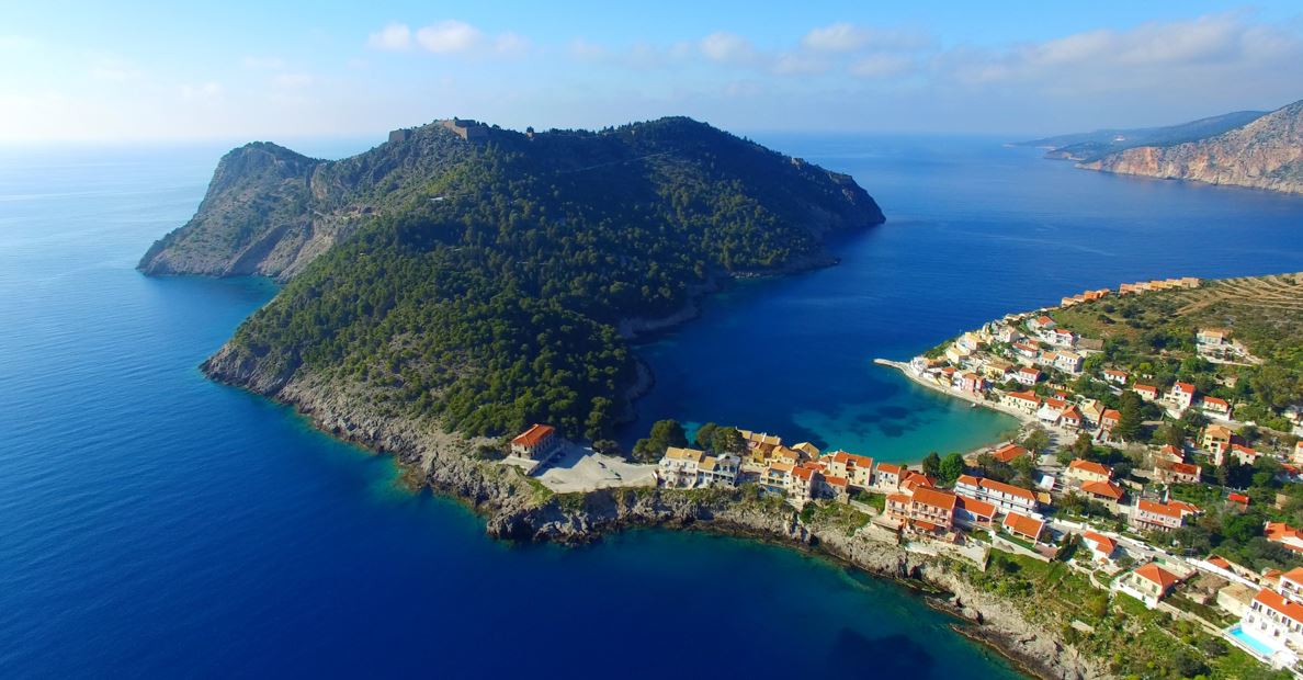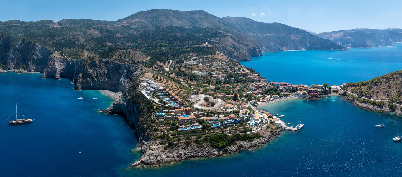 Η Άσσος βρίσκεται στη βορειοδυτική Κεφαλονιά, πάνω σε μια μικρή χερσόνησο που σχηματίζει φυσικά δύο “αγκαλιές” νερού. Αυτός ο διπλός όρμος είναι το πρώτο στοιχείο που ορίζει τον τόπο: προστατευμένο σημείο για σκάφη, για ανθρώπους, για εγκατάσταση. Όταν βλέπεις το χωριό από ψηλά, καταλαβαίνεις γιατί επιλέχθηκε ακριβώς αυτή η θέση: η χερσόνησος «κλείνει» το νερό και δημιουργεί ένα μικρό φυσικό λιμάνι, ενώ οι πλαγιές γύρω δίνουν οπτικό έλεγχο της ακτογραμμής.