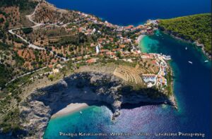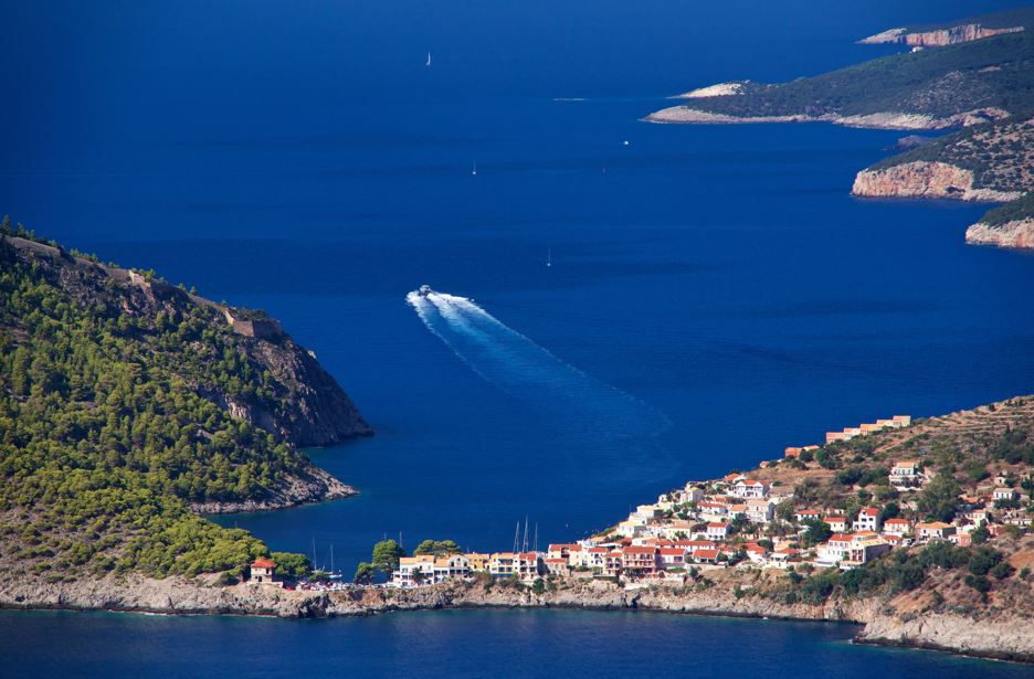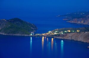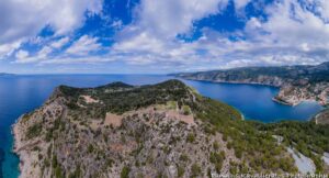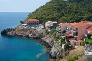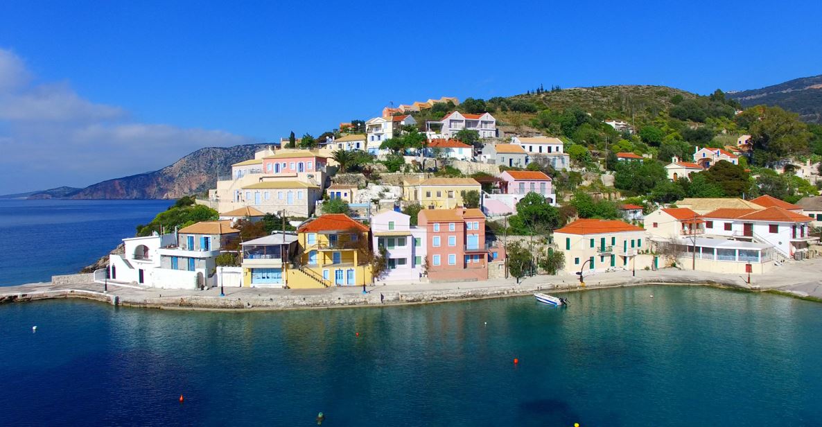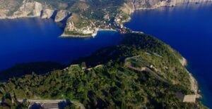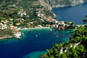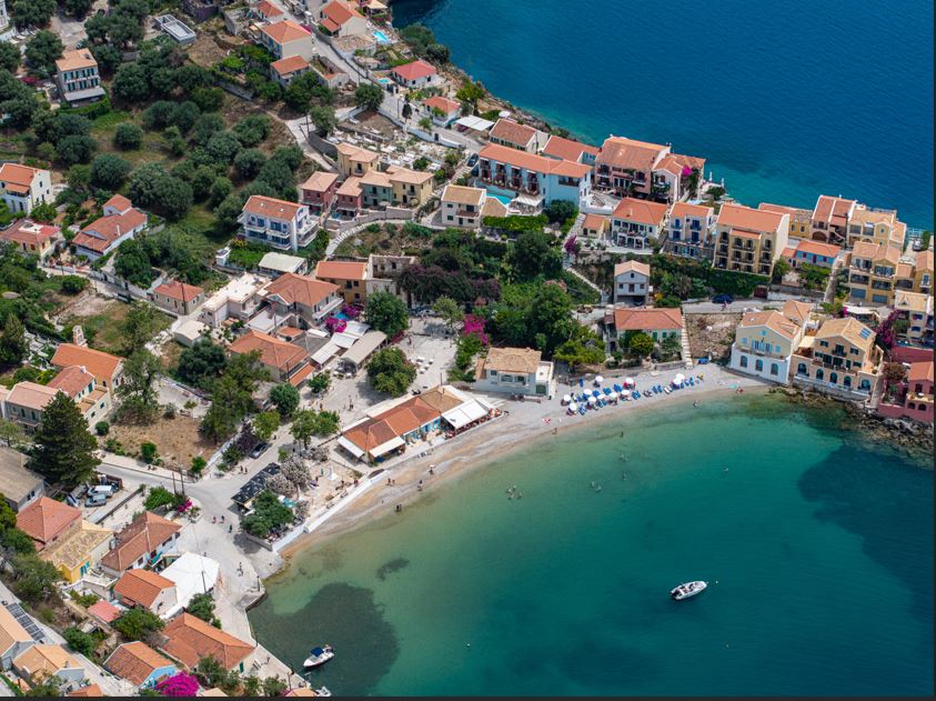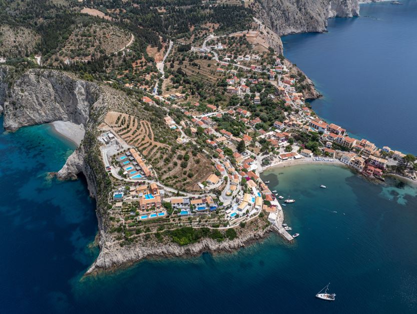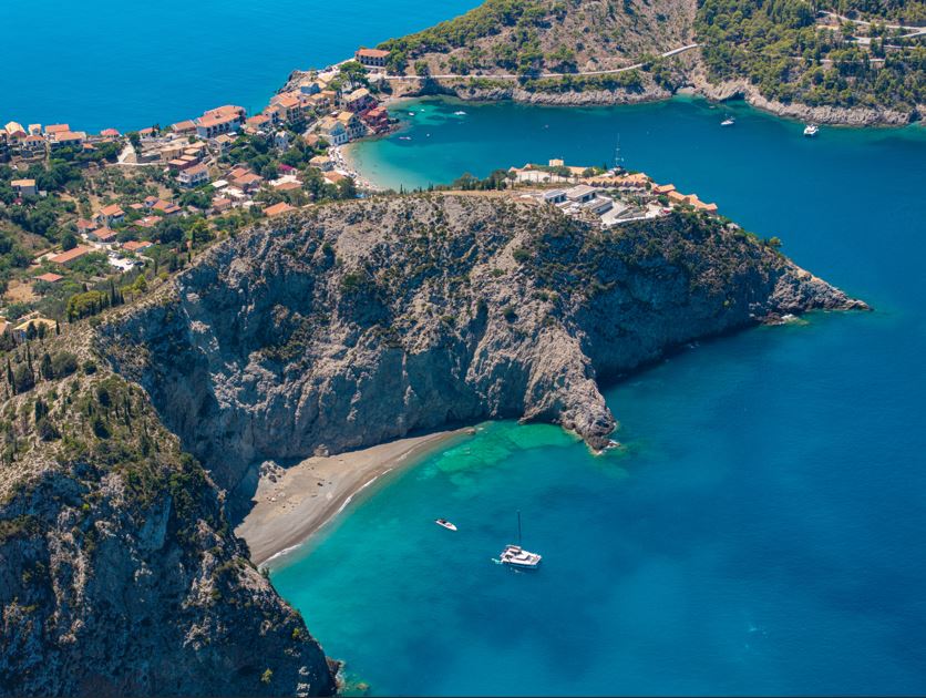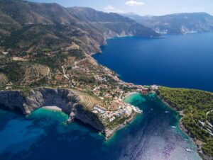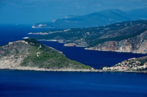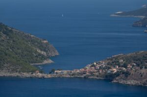 Η Άσσος βρίσκεται στη βορειοδυτική Κεφαλονιά, πάνω σε μια μικρή χερσόνησο που σχηματίζει φυσικά δύο “αγκαλιές” νερού. Αυτός ο διπλός όρμος είναι το πρώτο στοιχείο που ορίζει τον τόπο: προστατευμένο σημείο για σκάφη, για ανθρώπους, για εγκατάσταση. Όταν βλέπεις το χωριό από ψηλά, καταλαβαίνεις γιατί επιλέχθηκε ακριβώς αυτή η θέση: η χερσόνησος «κλείνει» το νερό και δημιουργεί ένα μικρό φυσικό λιμάνι, ενώ οι πλαγιές γύρω δίνουν οπτικό έλεγχο της ακτογραμμής.