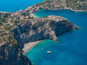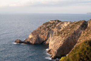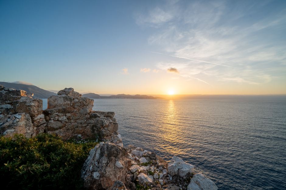 Σκηνή 2 – Η χερσόνησος: Προχώρα προς το σημείο που “λεπταίνει” η γη. Εκεί νιώθεις ότι βρίσκεσαι πάνω σε πέρασμα. Είναι το σημείο που ο τόπος σε αναγκάζει να κοιτάξεις γύρω: δεξιά-αριστερά, δύο θάλασσες/δύο όρμοι, και πάνω το κάστρο σαν σταθερή υπενθύμιση ότι εδώ η ασφάλεια ήταν θέμα ζωής.