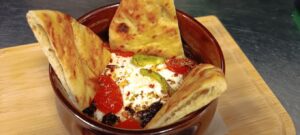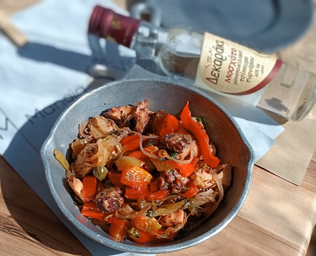 Στα πιάτα περιλαμβάνονται μεζέδες για κρασί, ούζο ή τσίπουρο, αργομαγειρεμένα φαγητά σε ξυλόφουρνο και χειροποίητα γλυκά. Θα συναντήσετε πιάτα που πατούν σε γνώριμες γεύσεις – λαχανικά εποχής, κρέας, θαλασσινά ανάλογα με την ημέρα – σε πιο σύγχρονες εκτελέσεις. Η έμφαση στην ελληνική κουζίνα, στις τοπικές συνταγές και στο καλό κρασί συνδέεται και με τον χαρακτήρα των Μαντζαβινάτων, περιοχής με ιστορική σχέση με την αμπελοκαλλιέργεια.